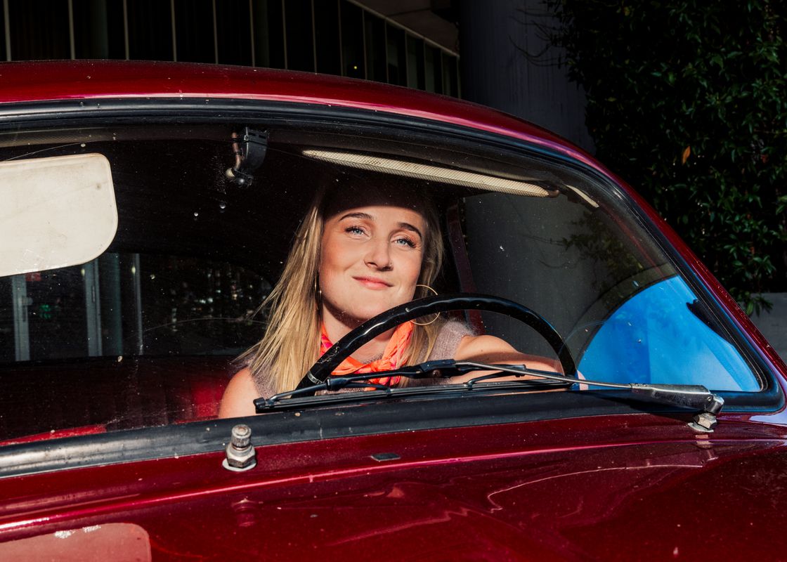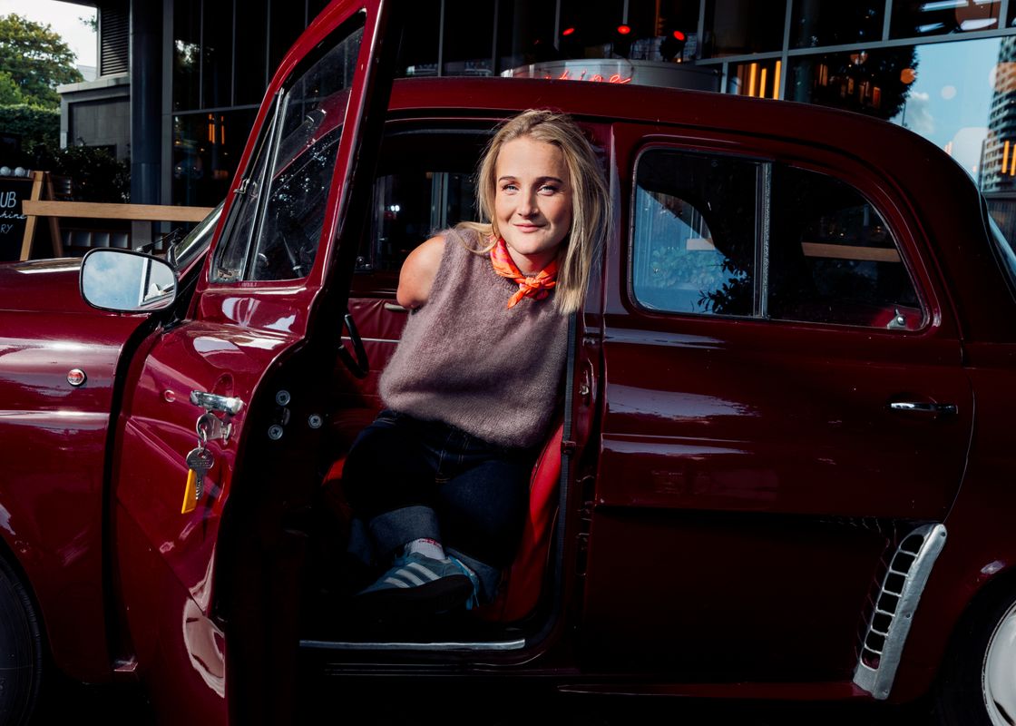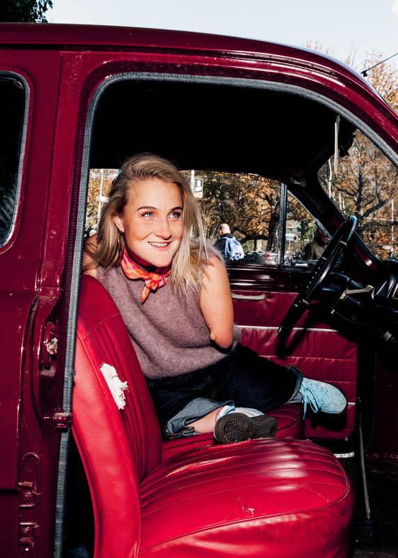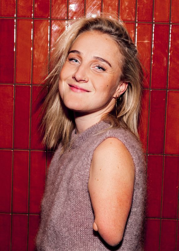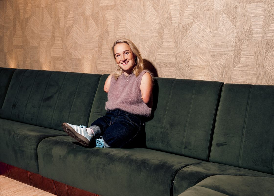 Eva Eikhout zit in een stoel van het theater met allemaal stoelen waar niemand op zit om haar heen. Ze glimlacht naar de camera en houdt haar hoofd schuin.